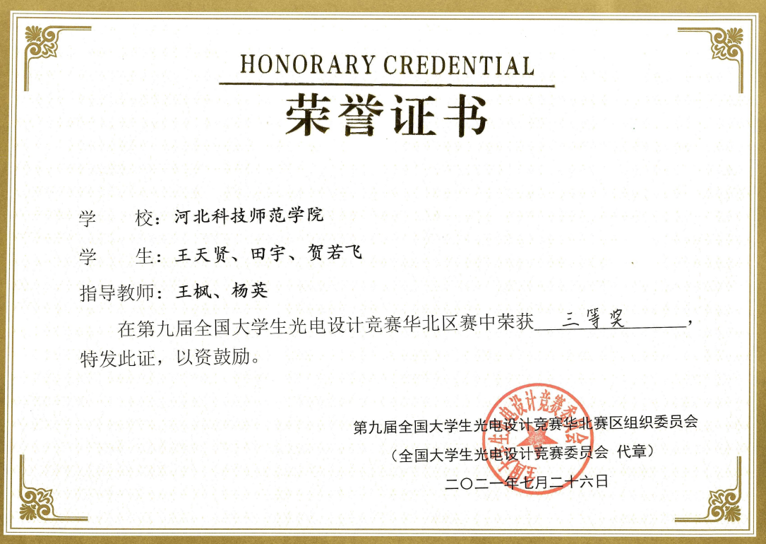 近日,由中国光学协会主办,燕山大学承办的第九届全国大学生光电设计竞赛(华北赛区)在燕山大学举行。来自北京、天津、河北、山西、内蒙古的31所高校的229支队伍共计1033名师生参赛。我校机电学院由3名学生组成了1支代表队参加了此次比赛,最后获得集体三等奖一项。
