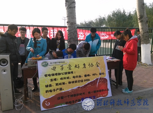 2014年11月8日上午,一区二区av举办“爱心维修•情系你我他”公益维修活动。面对损坏的电子物品,电子爱好者协会会员们耐心的进行维修,并向现场同学们进行讲解。当天,电子爱好者协会还在昌黎校区招聘会现场举办了作品展示活动,并与招聘单位,学校领导、老师进行现场交流。