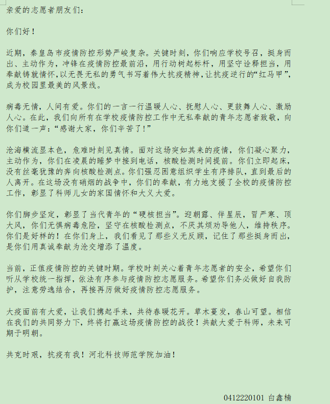 活动取得了圆满成功,本次活动展现了青年志愿者服务大局、奉献社会、引领成长的青春风采。发挥了志愿者服务先锋作用,在工作中学生们提高了对志愿活动的认识,增强了学生的自我责任感和使命感。